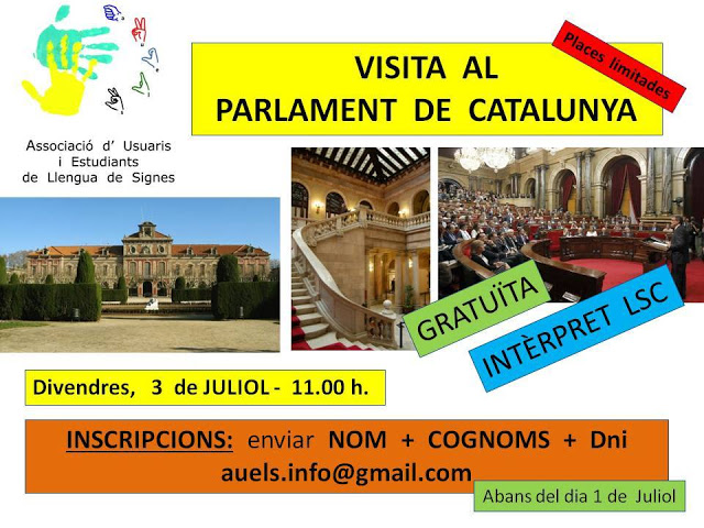 Una sortida d'activitat cultural organitzada per AUELS, amb els socis, usuaris i estudiants de LSC van assitir una visita guiada a Parlament de Catalunya. Compta una accesibilitat de intèrpret, van explicar i recorrer els passadissos, sales de reunions (junta de portaveus, comissions), ple de diputats i fins una exposició amb la història de Parlament de Catalunya.